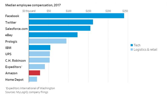 《华尔街日报》称,虽然亚马逊经常被称作硅谷的科技巨头,和Facebook,苹果,Alphabet(谷歌母公司)齐名,但其28446美元的员工薪资远远低于其他科技公司。