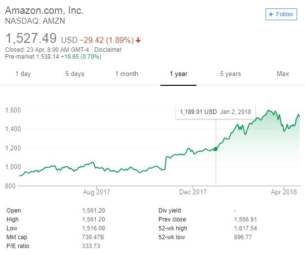 今年一月以来,亚马逊涨幅为28.5%。