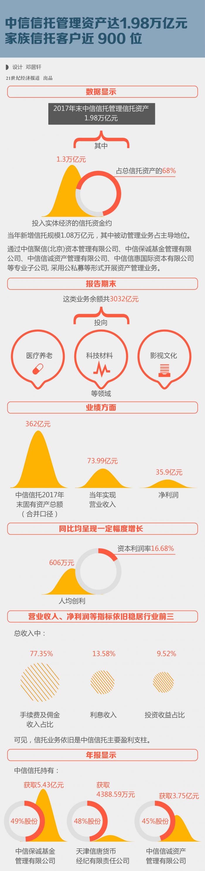 数据显示,2017年末中信信托管理信托资产1.98万亿元,其中投入实体经济的信托资金约1.3万亿元,占总信托资产的 68%。当年新增信托规模1.08万亿元,其中被动管理业务占主导地位。