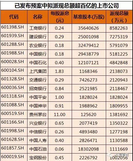 在已经公布分红预案的A股上市公司中,有16家公司拟进行超百亿现金分红。其中工商银行、建设银行、农业银行、中国银行等四家公司2017年度拟现金分红金额均在500亿以上,分别约858亿元、728亿元、579亿元、518亿元。
