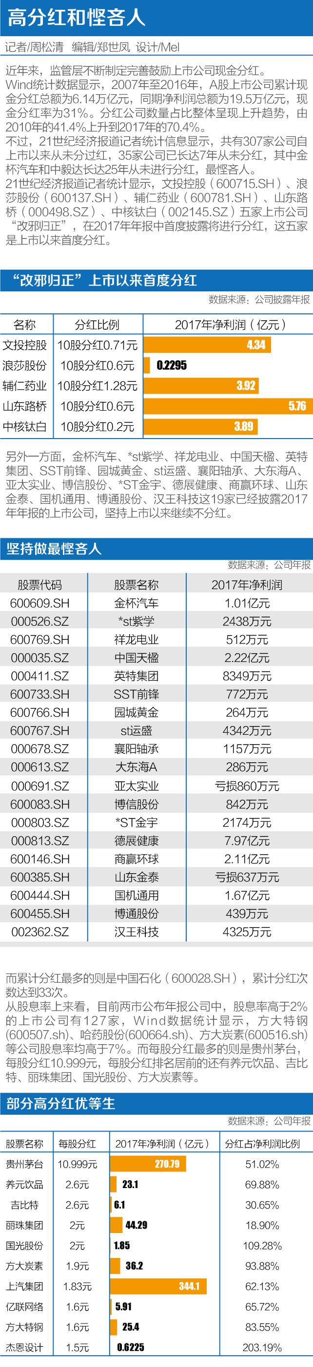 上市19年不曾分红的A股铁公鸡浪莎股份(600137.SH)也在2017年年报时披露将首次分红。