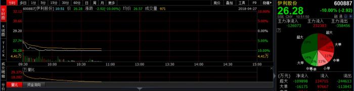 4月27日早间,伊利股份股价低开,随即一路下挫,至9点53分左右触及跌停。此后虽有小幅震荡,但最终被压在跌停板上,跌幅10%暂报26.28元/股。