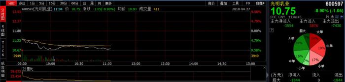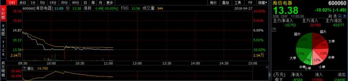 其中,海信电器(600060.SH)同样触及跌停,暂报13.38元/股;光明乳业(600597.SH)下跌近9%,暂报10.76元/股;小天鹅A(000418.SZ)下跌近3%,暂报63.91元/股。