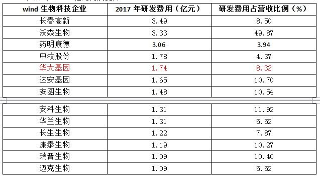 根据年报显示,2017年华大基因研发费用为1.74亿元,占总营收比例为8.3%,较2016年的1.76亿元,下滑了1.36%。