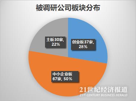 统计显示,过去一周被机构调研的这134家公司中,属于中小板的有67家,属于创业板的有37家,另外30家来自主板。中小创仍是机构调研的主要对象,占比接近7成。