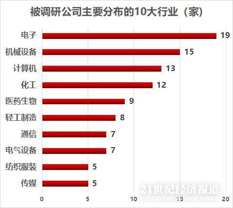 行业分布方面,电子、机械设备、计算机、化工行业最受机构青睐,共计占比44%。电子行业被调研的公司最多,有19家。