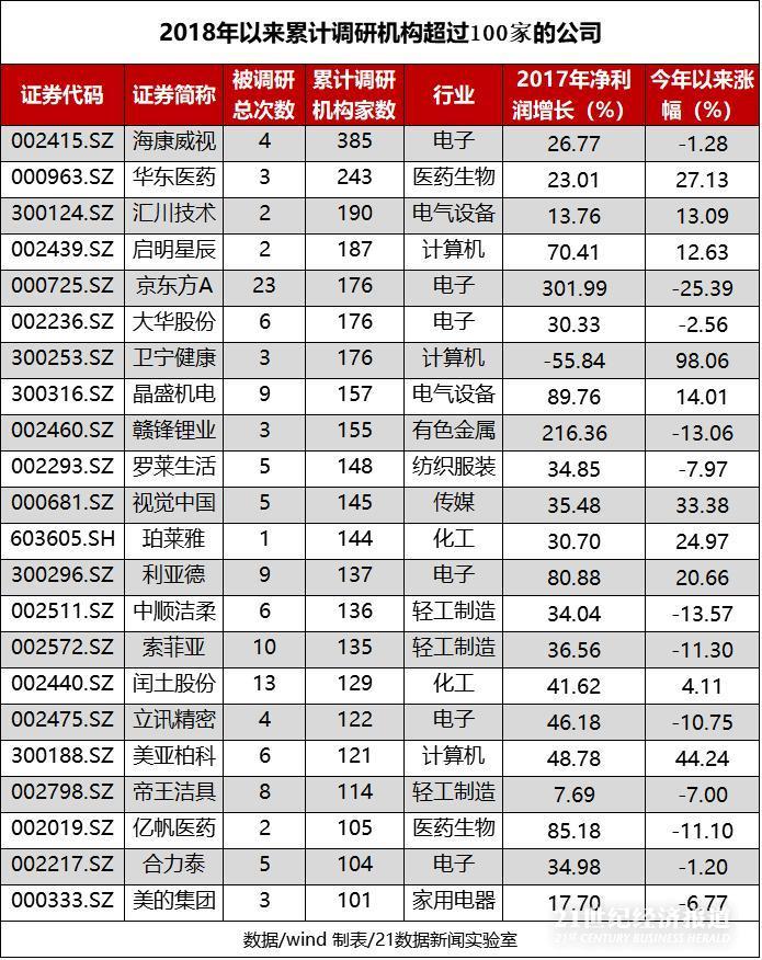 值得一提的是,据21数据新闻实验室统计显示,海康威视也是2018年以来接待调研机构最多的上市公司,累计385家公司对其进行调研。