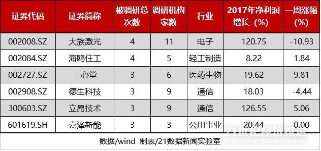 过去一周被机构调研次数最多的上市公司是大族激光(002008.SZ),共4次11家。