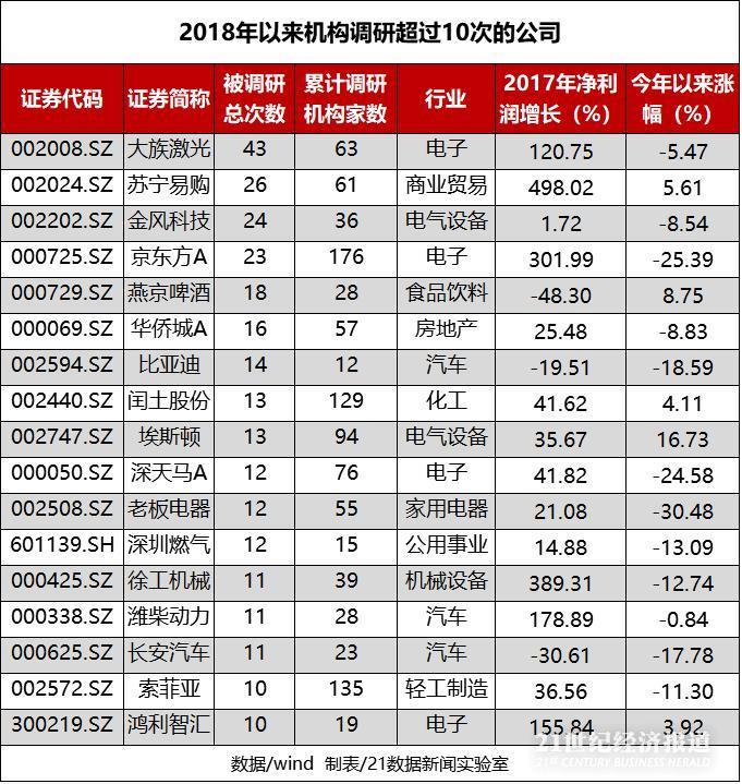 数据显示,2018年以来,有821家上市公司被机构调研过。其中22只股分别被100家以上的机构调研过,业绩方面,去年净利润涨幅最高的要数京东方A(000725.SZ)。