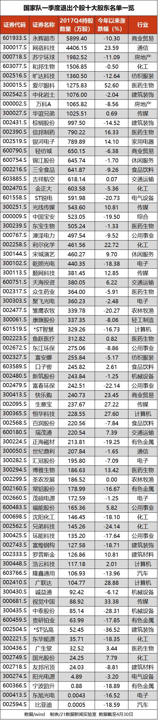 截至目前,上市公司2017年报及2018年一季报披露收官,国家队(包括汇金公司、证金公司、外管局旗下3个投资平台以及5支国家队基金)的投资图谱也浮出水面。据21数据新闻实验室统计,2018年一季度国家队共持有1115只个股,其中新进35只,退出72只。