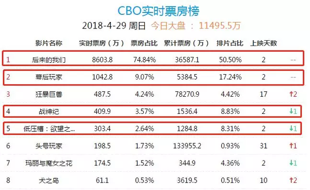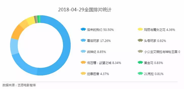 但从排片情况来看,《后来的我们》占据了绝对优势,4月29日的排片高达51.0%,比其他三部影片的排片加起来还高。