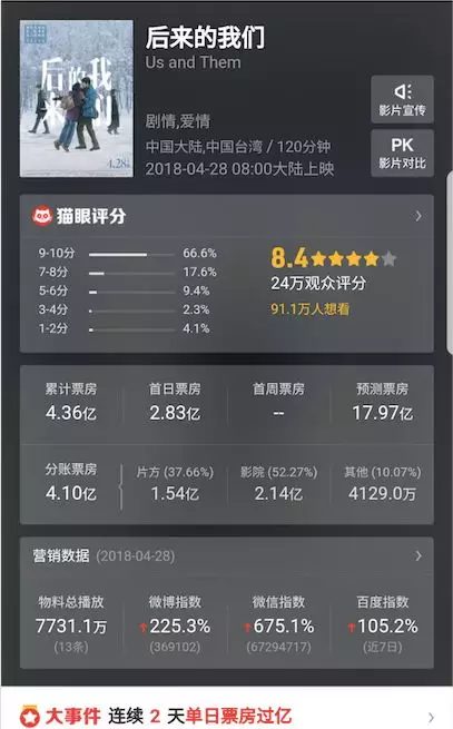 “后来的我们,什么都有了,却没了我们”,男女主在影片最后的这句感慨戳中了不少观众的泪点。事实证明,这一情感攻势十分有效,《后来的我们》预售票房过亿,上映仅数小时票房破2亿,截至4月29日15:30时许,票房已攀登至4.3亿元。
