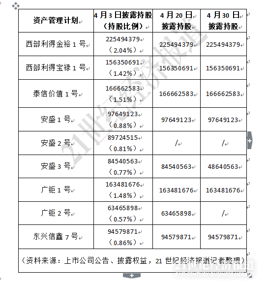今年4月3日,钜盛华公告,钜盛华与一致行动人合计持有万科28.04亿股,持股比例25.4%。其中,九个资管计划持有万科11.42亿股,持股比例10.34%。根据钜盛华披露的资料,截至4月30日,“广钜2号资产管理计划”名下已无万科A股份,“安盛3号资产管理计划”已减持约43%的万科股份。