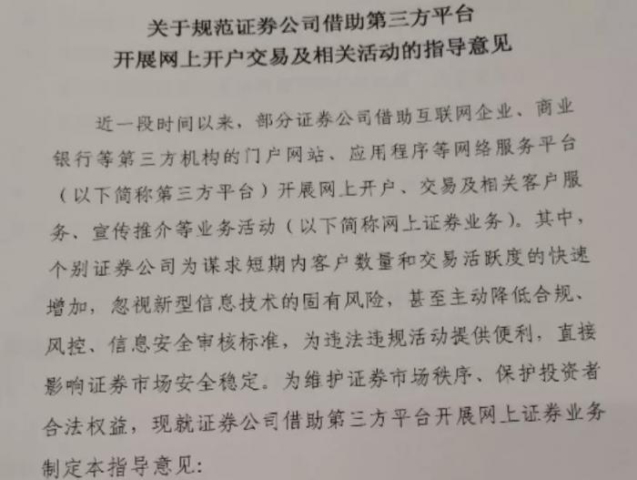 近一段时间以来,部分证券公司借助互联网企业、商业银行等第三方机构的门户网站、应用程序等网络服务平台(简称第三方平台)开展网上开户、交易及相关客户服务、宣传推介等业务活动(简称网上证券业务),其中,个别证券公司为谋求短期内客户数量和交易活跃度的快速增加,忽视了新兴信息技术的固有风险,甚至主动降低合规、风控、信心安全审核标准,为违法违规活动提供便利、直接影响证券市场安全稳定。