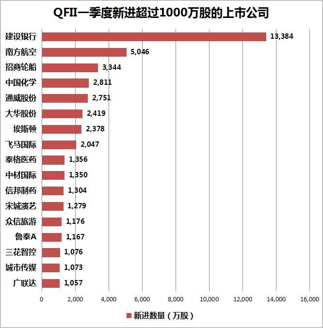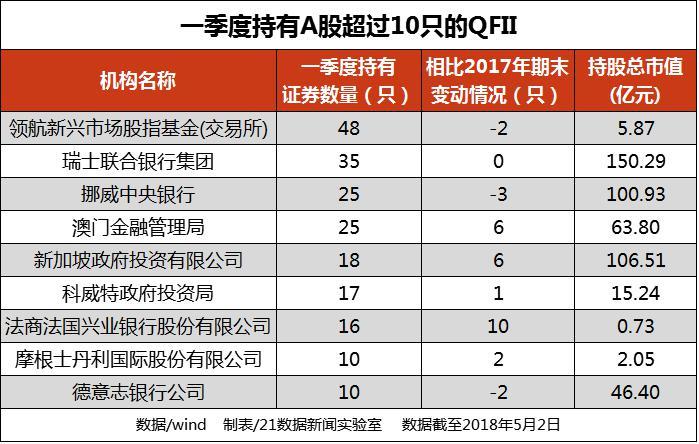 21数据新闻实验室统计发现,QFII一季度新进84只股。其中,17只个股的新进数量在1000万股以上。