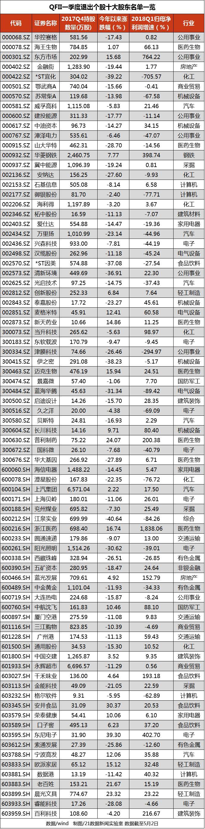 一季度,QFII退出了80只个股的前十大流通股东席位,电子、医药生物行业的最多,各有8只。