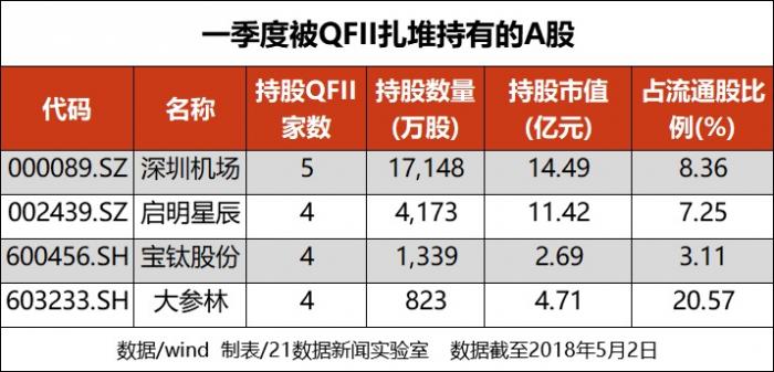 具体到个股,截至一季度末,多只A股被QFII扎堆持有。其中,深圳机场最多,有5家QFII持股。另外,启明星辰、宝钛股份、大参林都有4家QFII持股;从持股比例来看,大参林最高,占流通股比例超过20%。