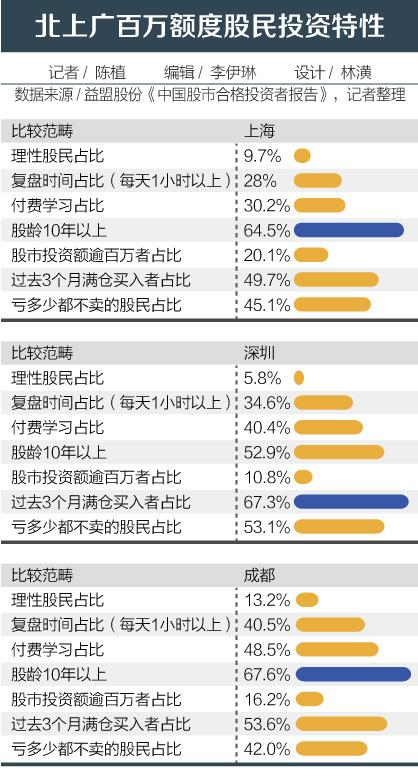 值得注意的是,不同地域理性股民占比高低,与当地股民股龄也呈现“正相关性”。以上海为例,超过10年股龄的股民占比达到64.5%,高于深圳;因此尽管上海股市投资额逾百万的股民占比(20.1%)比深圳(10.8%)高出约1倍,但满仓操作的上海股民占比(49.7%)远低于深圳(67.3%)。
