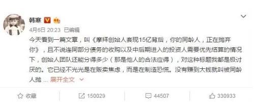韩寒等80后大V对此发文反驳,认为这种宣扬焦虑、传播恐慌的价值观并不可取。“很多人也都在努力干活认真生活,成功的定义绝不只是套现几亿十几亿。”