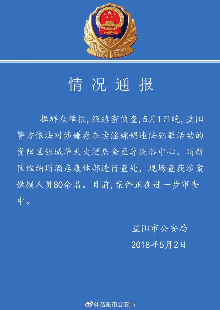 益阳市公安局官方微博称,5月1日晚,益阳警方依法对涉嫌存在卖淫嫖娼违法犯罪活动的资阳区银城华天大酒店金至尊洗浴中心、高新区维纳斯酒店康体部进行查处,现场查获涉案嫌疑人员80余名。据益阳市公安局权威人士处透露,该案系据群众举报,警方正对两处查处的涉案场所保护伞进行深挖 ,案件正在进一步审查中。