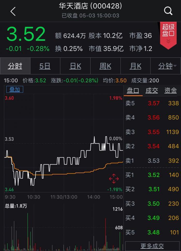 当日,华天酒店股价微跌0.28%,振幅高达2.27%。