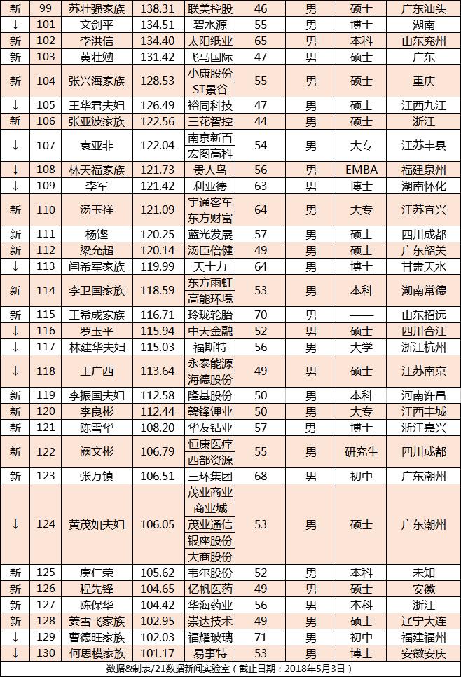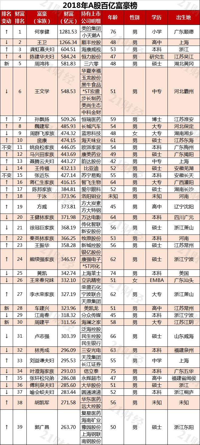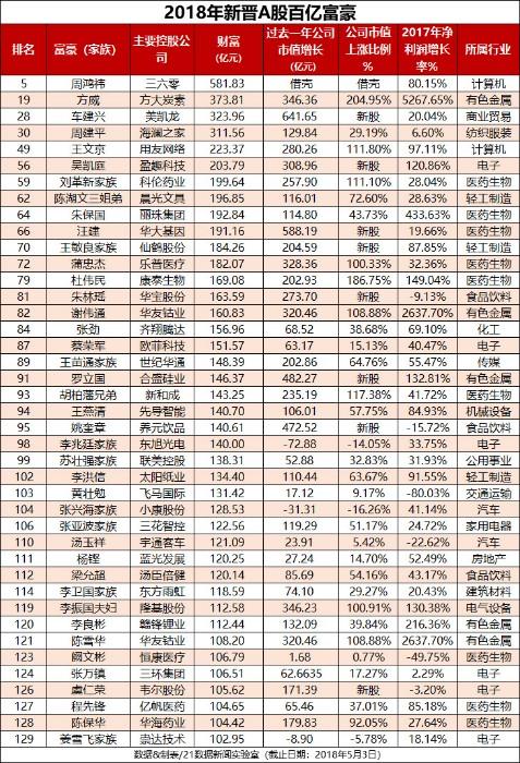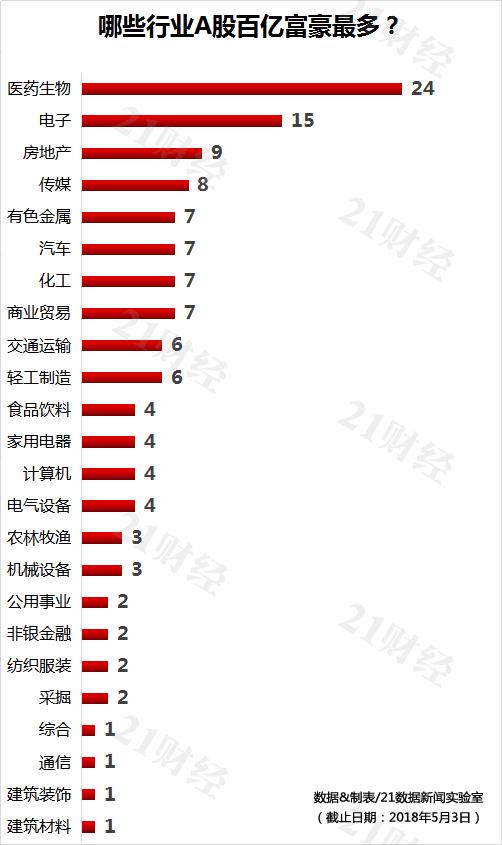 2018年5月3日,21数据新闻实验室发布《2018年A股百亿富豪榜》。上榜富豪的财富计算截止日期为2018年5月3日,主要根据A股上市公司中实际控制人为个人或家族的直接和间接持股比例来计算。