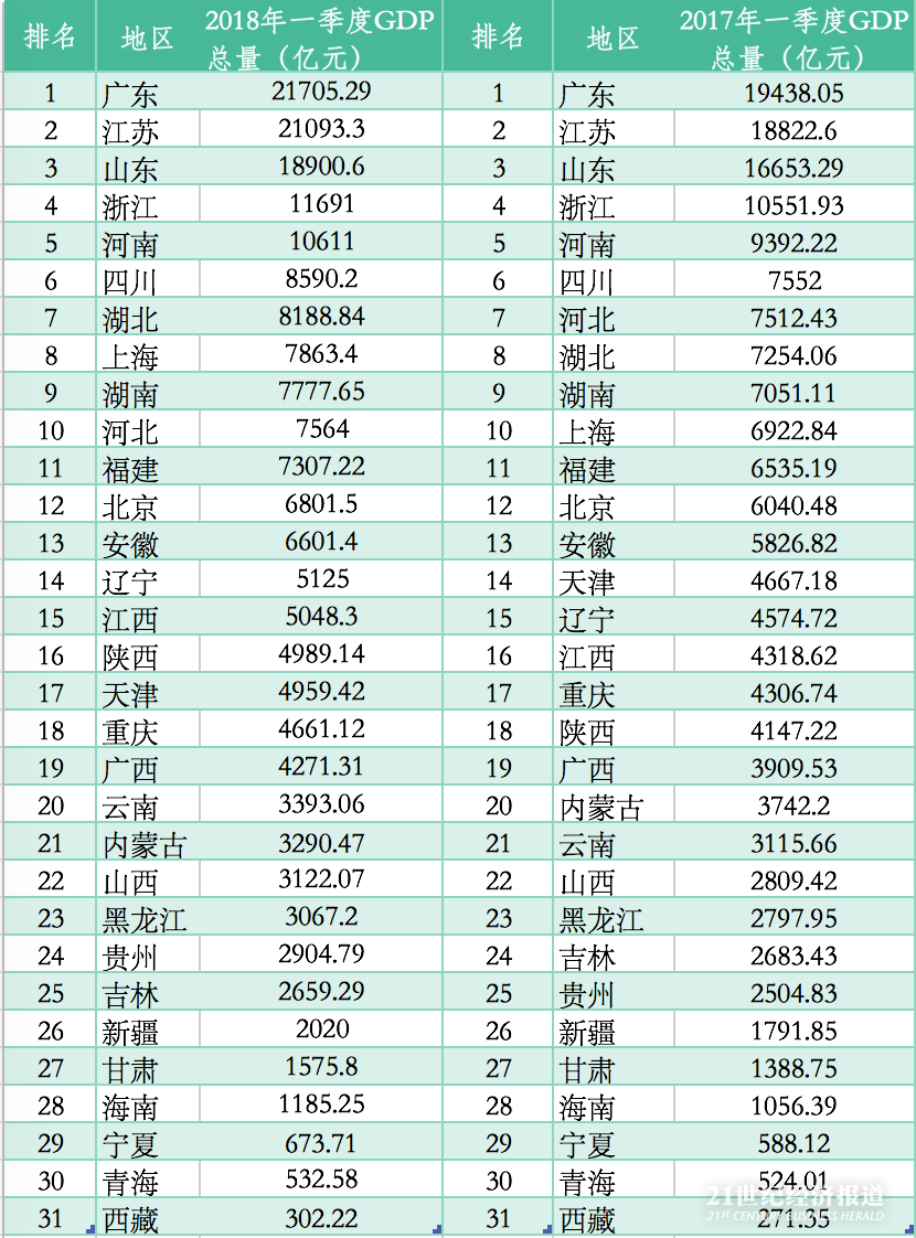 其中,广东、江苏、山东、浙江、河南、四川排名仍为全国前六名。广东和江苏,是全国一季度经济总量突破2万亿的省份。