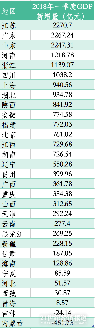 从经济增量来看,一般是经济总量越大,新增量更大。比如今年一季度江苏、广东、山东的经济新增量在2000亿以上,其中江苏2018年一季度经济新增量为2270.7亿元,为全国第一。