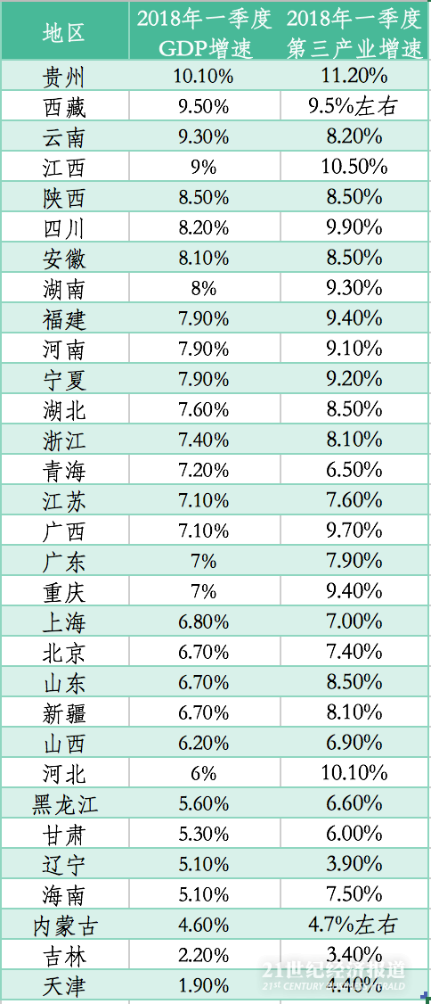 广东一季度经济总量仍为第一,达到21705.29亿元;经济增速第一的是贵州,增速达到了10.1%,为全国唯一两位数增长的地区;名义增速最高的是陕西,达到了20%以上。