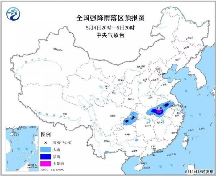 2、4日,中央气象台发布暴雨蓝色预警:预计未来三天,西南地区东部、江汉、江淮、江南及华南北部有一次强降雨过程,重庆南部、湖北、河南南部、安徽中南部、江苏中南部等地有暴雨,局地大暴雨并伴有短时强降水、雷暴大风等强对流天气。过程最强时段为5日白天至6日夜间。