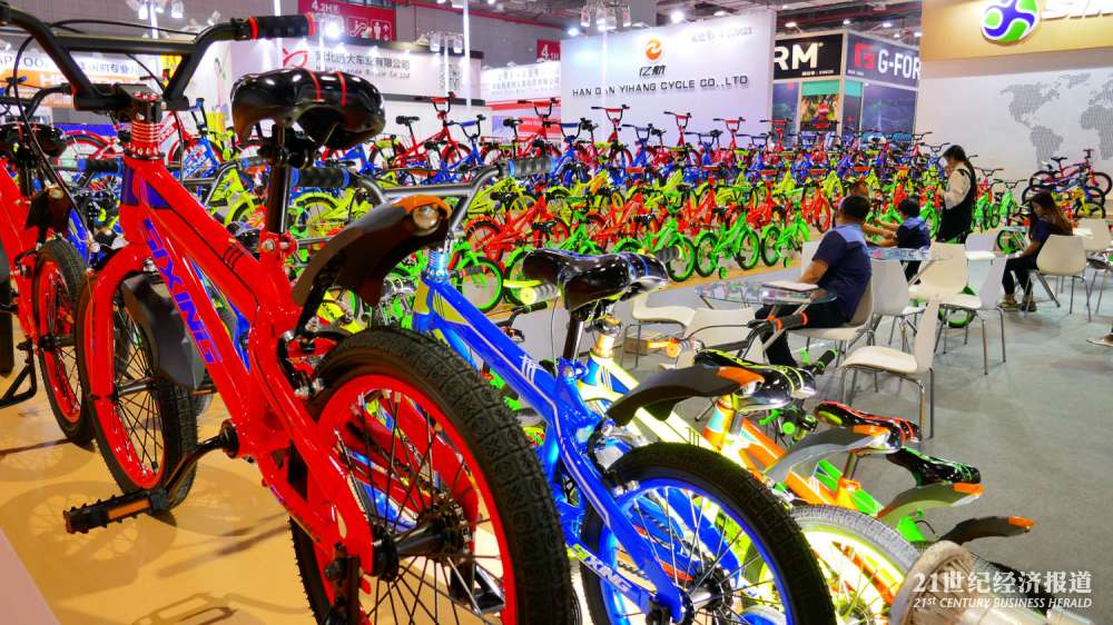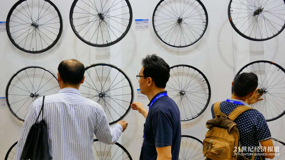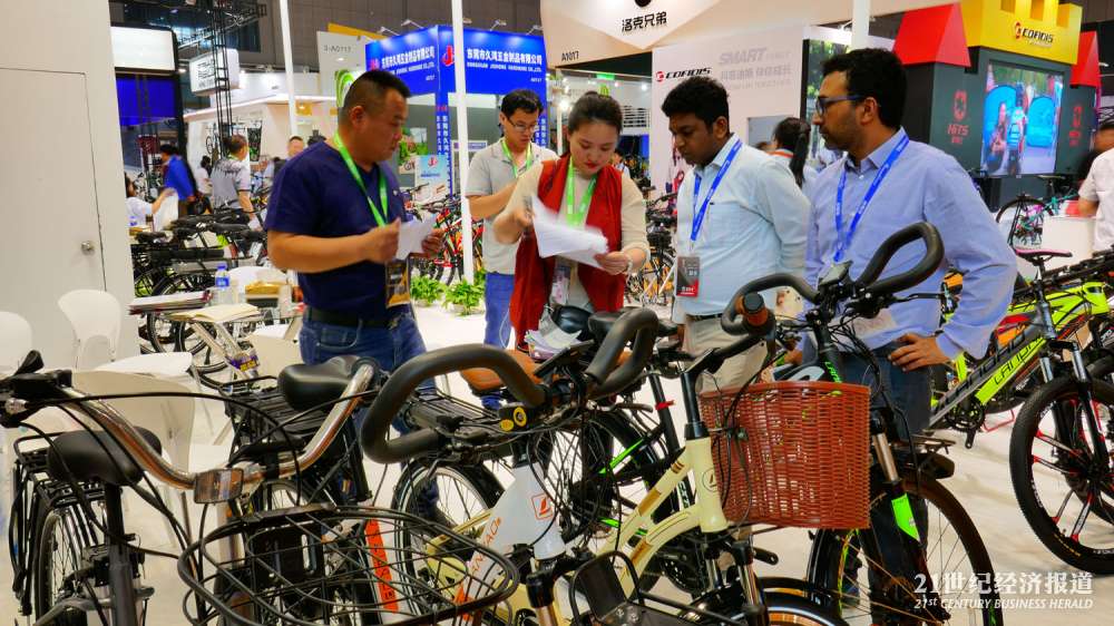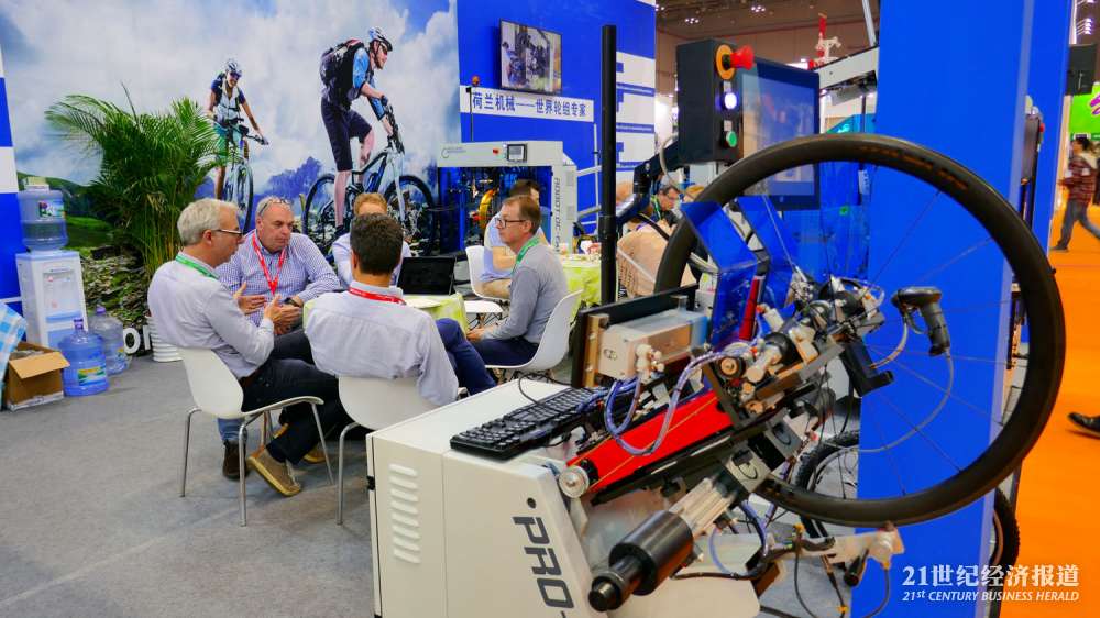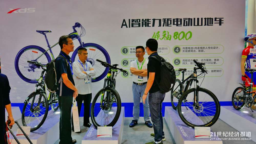 某国内自行车知名厂商 工作人员给外商介绍新产品。