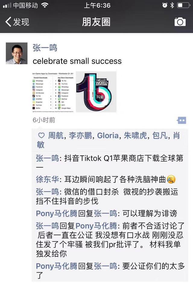 5月8日,张一鸣在朋友圈发了两张抖音的图,庆祝抖音Tiktok Q1在苹果商店下载量全球第一。这条朋友圈引发朱啸虎、包凡等人点赞,没想到却引发了腾讯CEO马化腾的“回怼”。