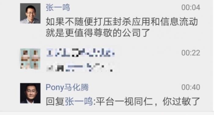 随后二人在评论区开展激烈交锋,张一鸣暗指腾讯随意打压封杀应用和信息流动,马化腾则称,微信作为平台一视同仁,张一鸣过度敏感了。