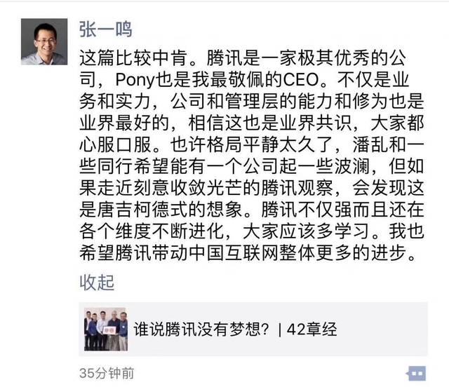 值得注意的是,今日头条创始人兼CEO张一鸣在朋友圈转发文章《谁说腾讯没有梦想》,并发表评论,他说:“腾讯是一家极其优秀的公司,Pony也是我最敬佩的CEO。不仅是业务和实力,公司和管理层的能力和修为也是业界最好的,相信这也是业界共识,大家都心服口服。”