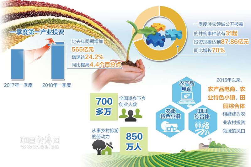 在业内看来,农业农村投资热与消费结构升级和规模经营发展密不可分。受城乡居民消费结构升级拉动,一季度优质农产品市场供销两旺,乡村消费品零售额同比增长10.7%,吸引了各类资本看好农村市场。据统计,仅生鲜电商平台就增加10亿多元投入。同时,各类农业新型经营主体发力适度规模经营,对农业投资的积极性在不断加大。今年前两个月,畜牧业固定资产投资增长37.4%,大部分投向了规模化养殖场。