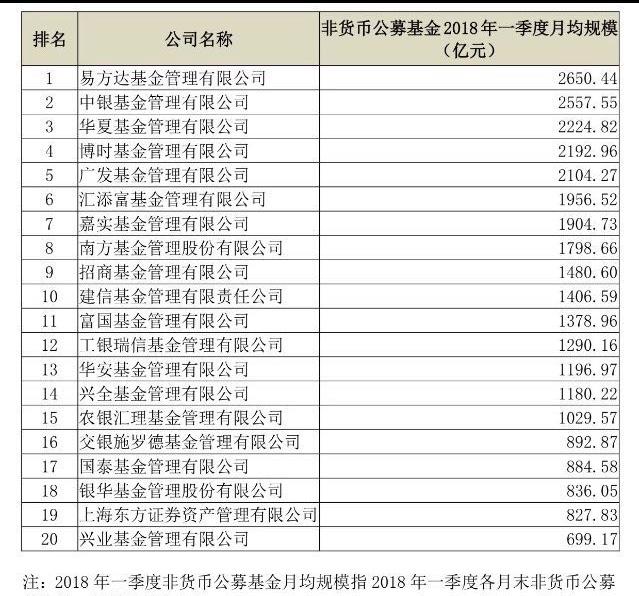 5月10日中国证券投资基金业协会公布了2018年一季度的基金管理机构非货币公募基金月均规模前20名。