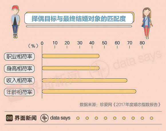 然而,珍爱网统计数据显示,择偶目标与最终结婚对象的职业相符率只有45.6%,是所有统计项目中最低的。匹配度最高的项目是年龄和收入。