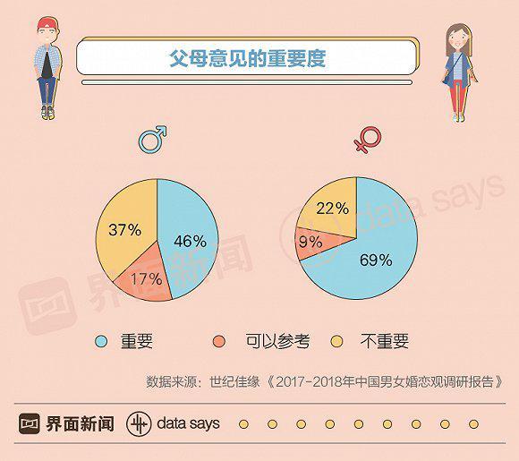 当相亲对象的各方面条件都已满足自己的要求时,近七成的女性会去征求父母的意见,并把他们的意见摆在十分重要的位置。此外,只有不到一半的男性认为父母的意见很重要,近四成认为不重要。