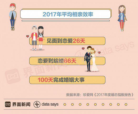 根据珍爱网的统计,在亲友和婚恋网站的“助攻”下,相亲正在变得越来越“高效”。2017年,相亲男女从初次见面到确定恋爱关系,平均花费一个月,从恋爱到结婚平均花两个多月。