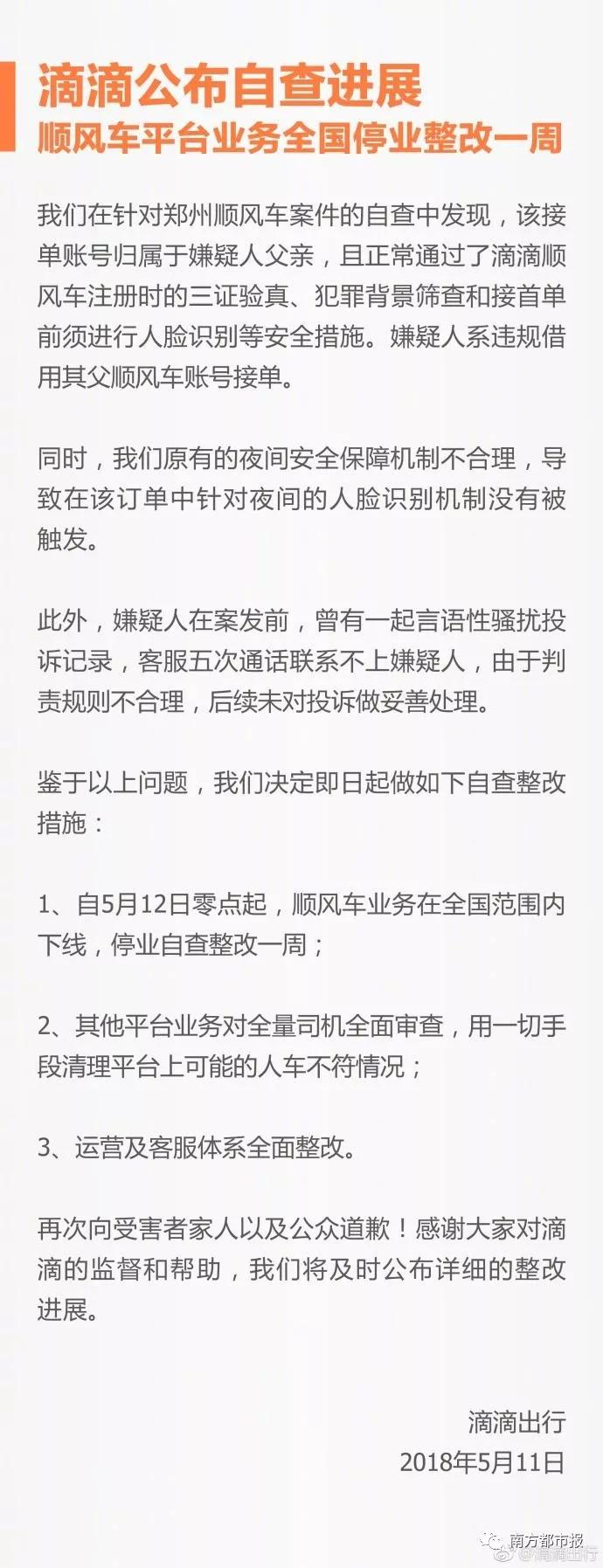 此外,针对近日一名空姐在郑州使用滴滴软件乘坐顺风车遇害一事,11日,滴滴公布自查进展称,嫌疑人刘某华使用的账号归属于其父亲,正常通过了注册时的三证验真,系违规借用其父顺风车账号接单。滴滴同时表示,自5月12日零点起,顺风车业务在全国范围内下线,停业自查整改一周。