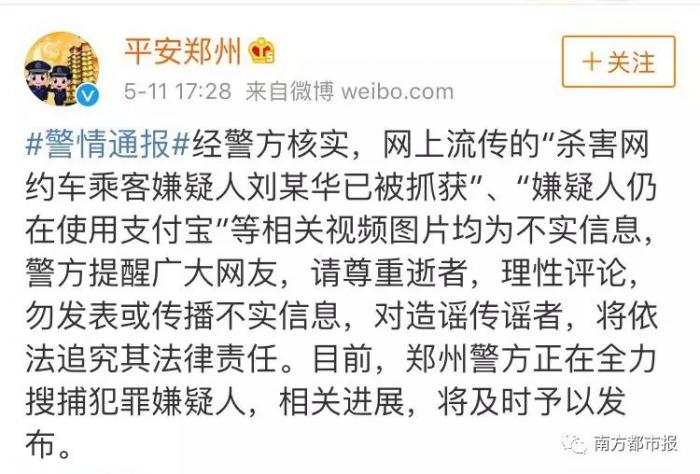11日下午5时许,@平安郑州发布辟谣声明,经警方核实,网上流传的“杀害网约车乘客嫌疑人刘某华已被抓获”、“嫌疑人仍在使用支付宝”等相关视频图片均为不实信息。详情声明如下↓↓