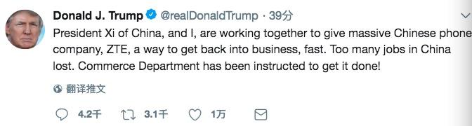 当地时间5月13日,特朗普发推文称:“习主席和我正在合作,将为中兴提供一种很快恢复业务的途径。(中兴事件造成)中国很多工作岗位丢失了。商务部已被指示去完成这件事。”