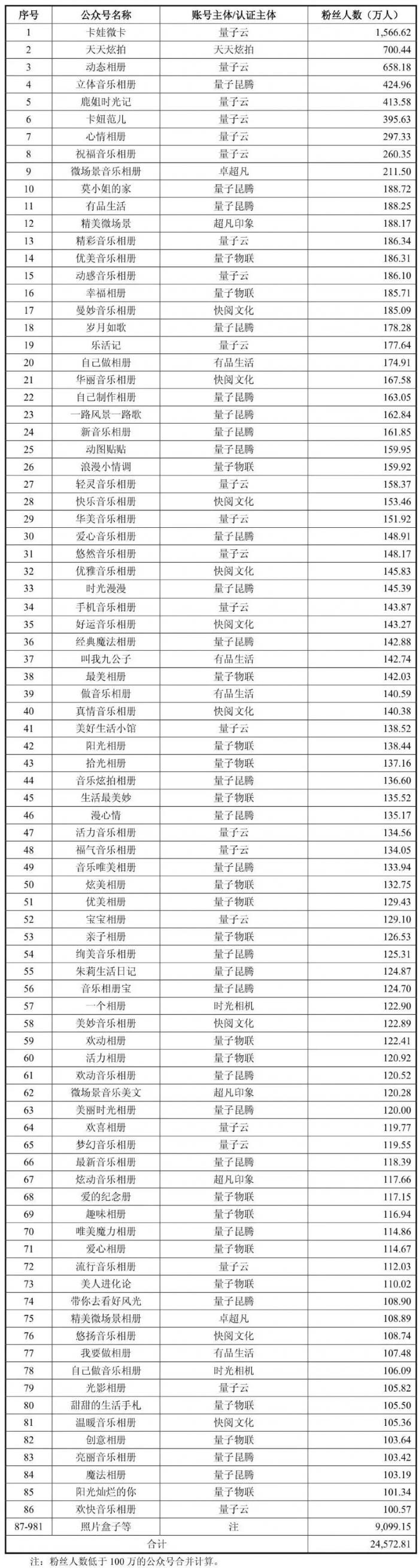 量子云目前运营981个微信公众号,旗下主要公众号“卡娃微卡”和“天天炫拍”每日分别平均发布包含原创文章在内的8篇文章。请公司补充披露: