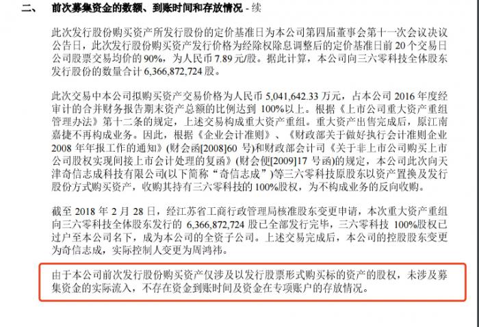 三六零与江南嘉捷的交易中,只采用资产置换和发行股份购买资产的形式,彼时,三六零作价504.16亿元,江南嘉捷出售其9.71%股权,作价1.82亿元抵消三六零拟置入资产的等值部分,另外502.35亿元资产则由江南嘉捷发行股份向三六零全体股东购买,股票发行价格为7.89元/股,发行股数为63.67亿股。