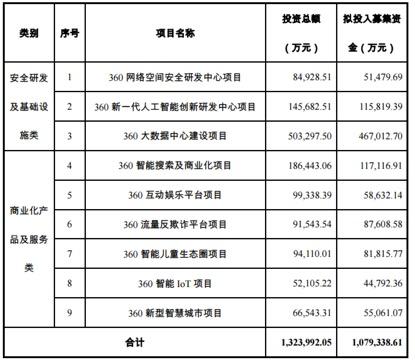 根据三六零最新发布的公告显示,其非公开发行股票拟募集的不超过107.93亿元,将用于9个项目,包括3个安全研发及基础设施类项目和6个商业化产品及服务类项目。