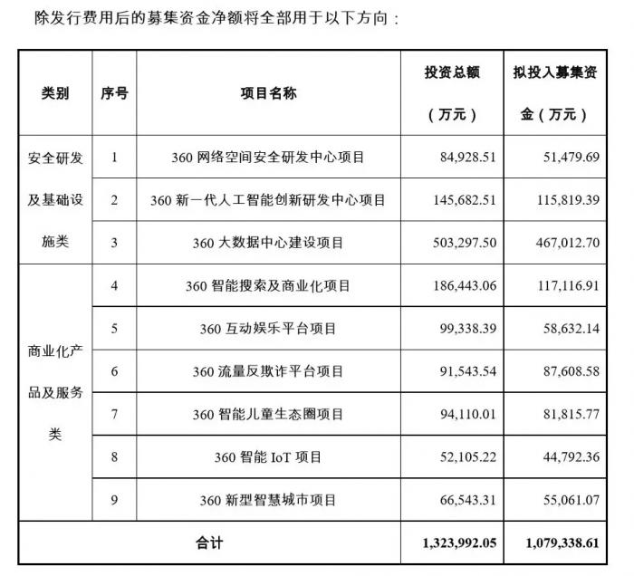 按照公告,募集资金将用于9个项目。其中3个安全研发及基础设施类项目,6个商业化产品及服务类项目。
