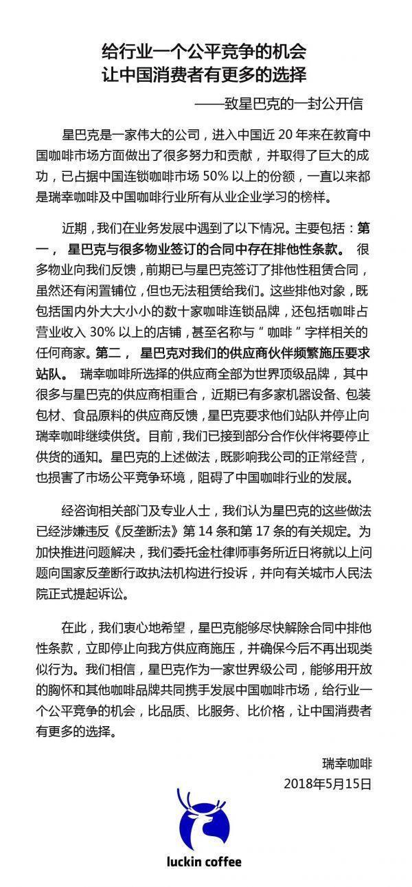 今日,luckin coffee(瑞幸咖啡)发布一则公开信,向星巴克正面宣战。瑞幸咖啡在声明中指出,星巴克在与物业签订的合同中存在排他性条款,并且要求供应商“二选一”。