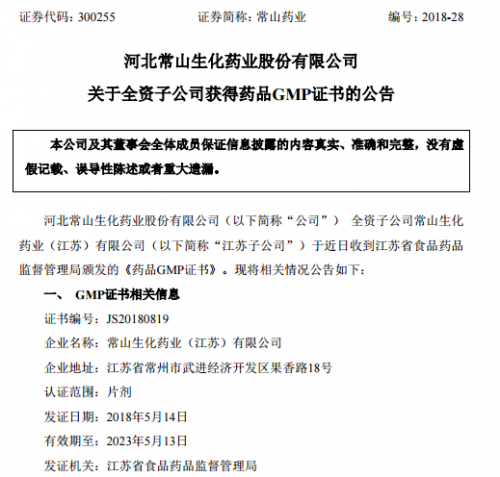 常山药业5月15日晚间发布公告,全资子公司常山生化药业(江苏)有限公司近日收到江苏省食品药品监督管理局颁发的《药品GMP证书》。本次《药品GMP证书》认证的车间为固体制剂车间,生产品种为枸橼酸西地那非片剂。枸橼酸西地那非适用于治疗勃起功能障碍(ED)。