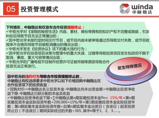 投资者提供的《慧誉1号2017年度管理报告》对上述事件做如下说明,“截至报告期末,节目已播出30集,自31集开始,四川卫视于2016年11月2日针对节目出具调整公告函,终止节目正常播出。截至报告日,中哲光宇已向四川卫视宣告:由于四川卫视违约,导致所投资项目《宠物的秘密生活》始终未能复播,中哲光宇决定终止与四川卫视的合作”。