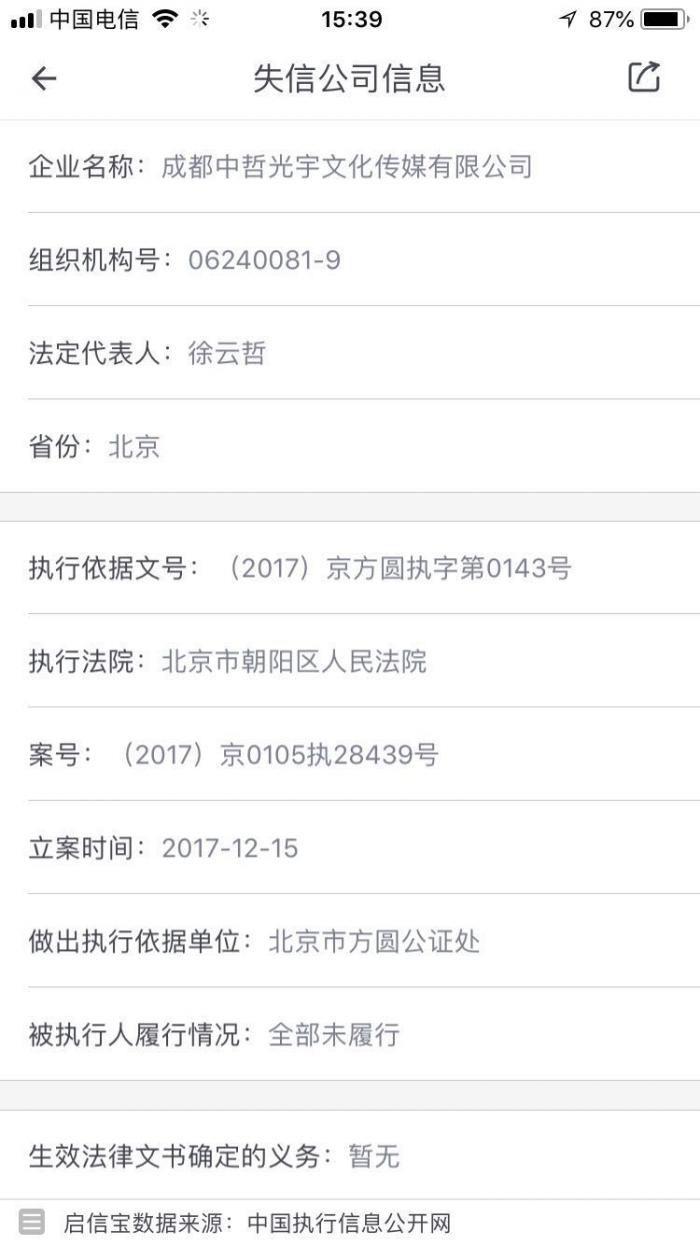根据慧誉1号2017年度报告,中哲光宇及四位股东被朝阳法院列入失信被执行人,并被采取限制消费、限制出境措施。工商资料已显示,中哲光宇被列为失信公司。